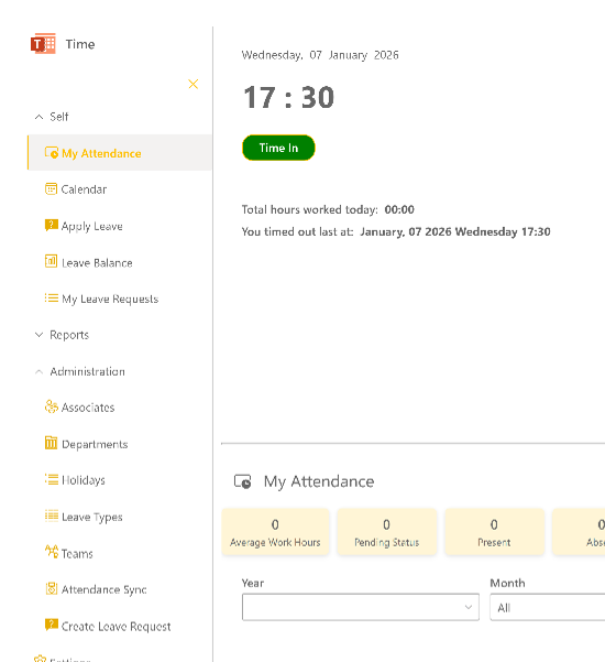 From daily swipe-ins to organisation-wide attendance reports, Time Works simplifies workforce operations with automation, transparency, and real-time insights—fully integrated into your Microsoft 365 environment.