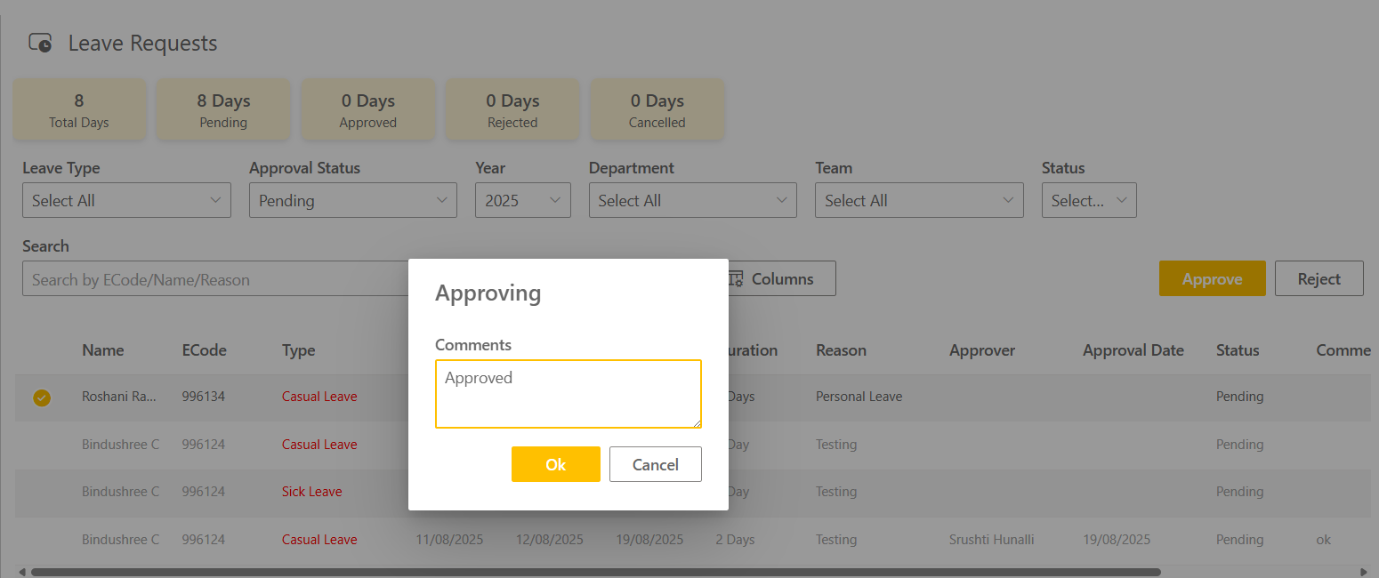 Approve or reject leave requests with optional manager comments